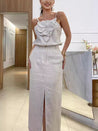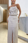 Apricot Vanilla Linen 2 Pieces Outfits w/ Top Three-Dimensional Flower Design & Sling Top Pockets Skirt