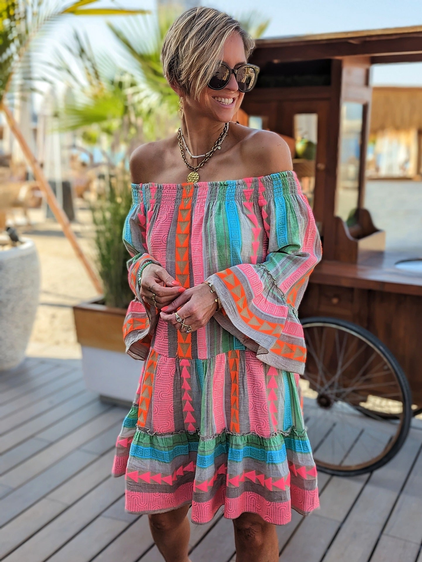 Elevate your style with our Vibrant Patchwork Ruffle Flared Sleeve Dress! This Bahamian-inspired dress is a must-have for any fashion-forward woman. Its dynamic patchwork design and flared sleeves will add a touch of fun and femininity to your wardrobe. Get ready to turn heads and feel gorgeous in this one-of-a-kind dress!