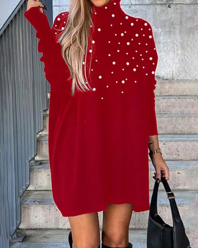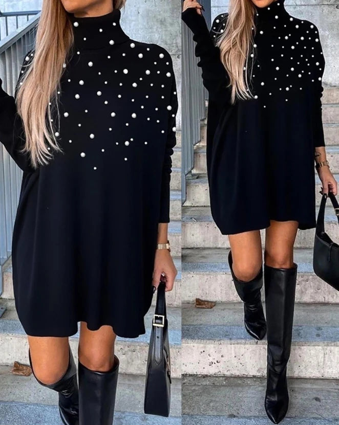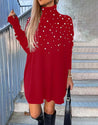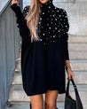 Think of all the amazing looks you can put together with this stunning dress! Made from heavy-weight fabric, this dress shapes a turtleneck that leads into long, fitted sleeves. The neck and bodice are embellished with pearls that steal the spotlight. The dress features a relaxed silhouette that ends in a maxi hem. Grab it right away!