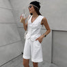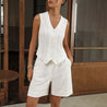 This stylish ensemble features a White Sleeveless Vest and Short Shorts, perfect for any summer occasion. Enjoy a comfortable and trendy outfit that will make you stand out from the crowd. Upgrade your style today with our White Two-piece Set!