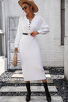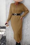 Stay cozy and stylish in this Decorative Button Notched Dropped Shoulder Long Sweater Dress. Adorned with decorative buttons and featuring a notched neckline and dropped shoulder design, this dress combines fashion with comfort. Perfect for any occasion, stay warm and fashionable all winter long.