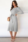 Achieve effortless style with this Round Neck Long Sleeve Tie Waist Midi Sweater Dress! Featuring a cozy round neck, long sleeves, and a flattering tie waist, this dress is both comfortable and chic. Perfect for any occasion, elevate your wardrobe with this must-have piece.