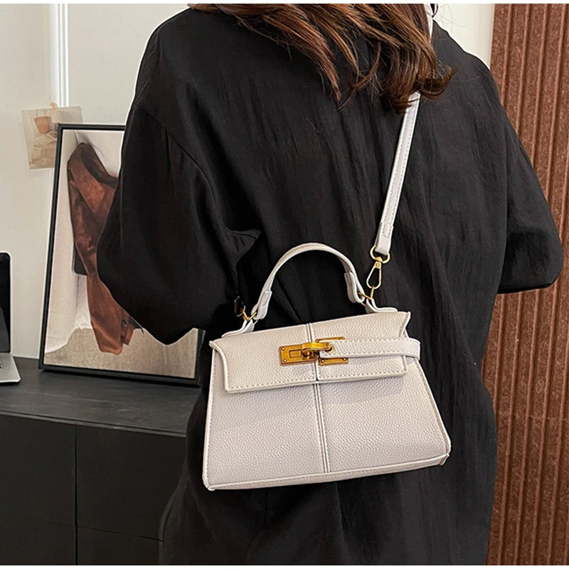 Add a fun twist to your look with the Gold Lock Luxury Design Handbag’s unique trapezoid shape.