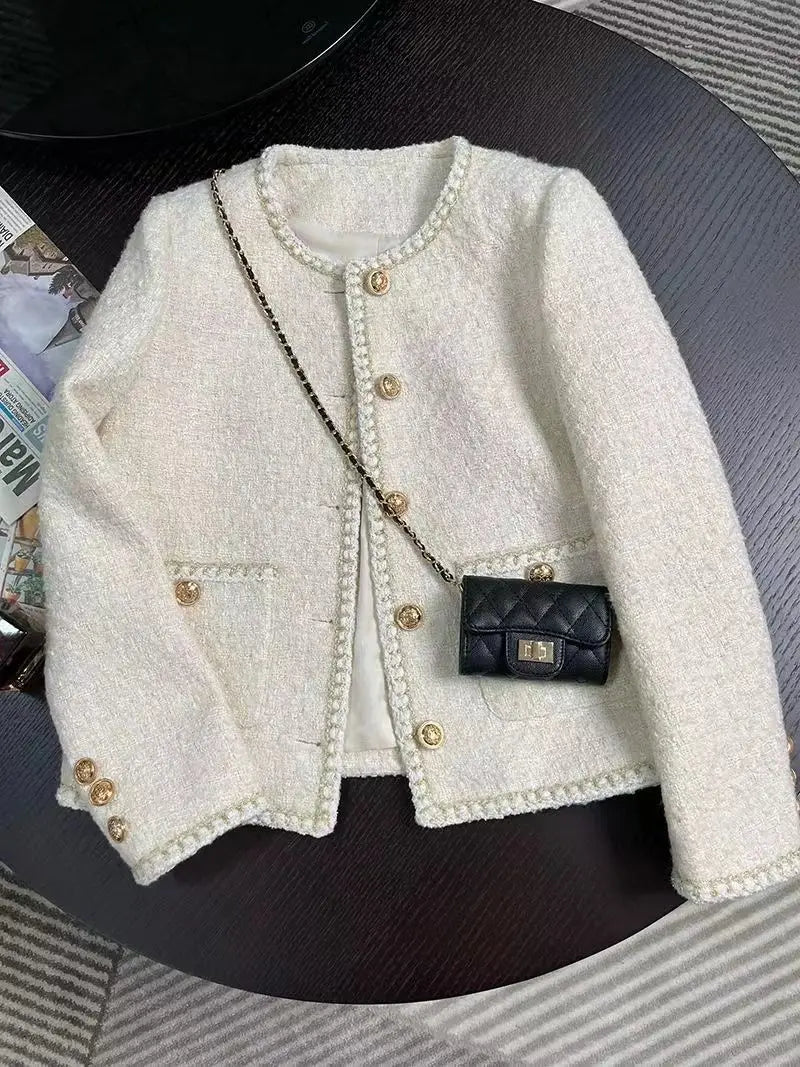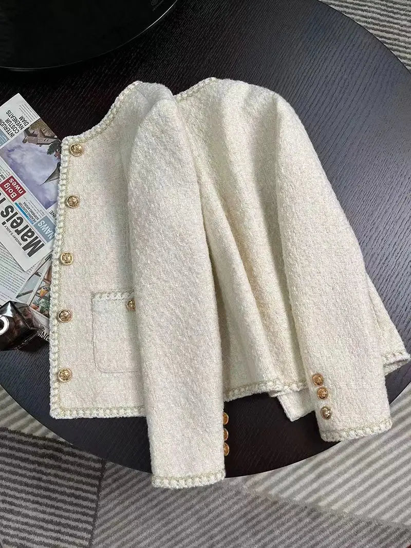 Make a statement with the Love Swept Jacket. It is made from luxe tweed in beige that is lightweight and versatile, shaping a round neck with long sleeves. The relaxed bodice is finished with gold engraved buttons that add a hint of gleam to the overall look, complemented by braided piping. Pair yours with denim jeans and a polo neck to create a perfect weekend outfit. Order yours today!