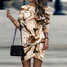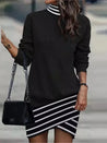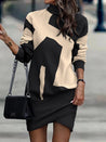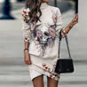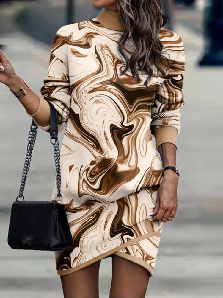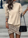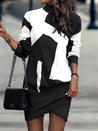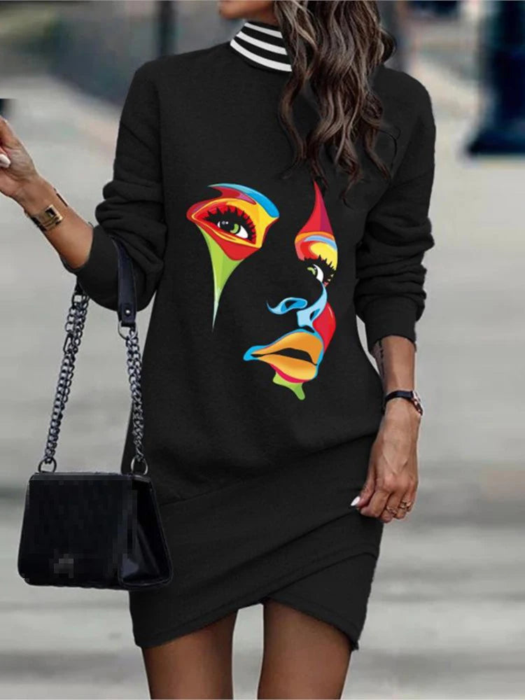 This dress will have you gathering some attention no matter the occasion. Slightly stretchy polyester shapes this dress that is decorated all over with quite an interesting irregular print. Featuring a turtleneck, this dress leads to three-quarter sleeves that frame the relaxed bodice perfectly. The dress slightly hugs the body along the hips before ending in a flirty mini hem.