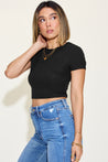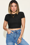 Elevate your wardrobe with our Classic Comfort Ribbed Round Neck Short Sleeve Top. Made with soft, ribbed fabric, this top offers ultimate comfort while still looking stylish. The classic round neck and short sleeve design make it versatile for any occasion. Upgrade your basics with this must-have top!