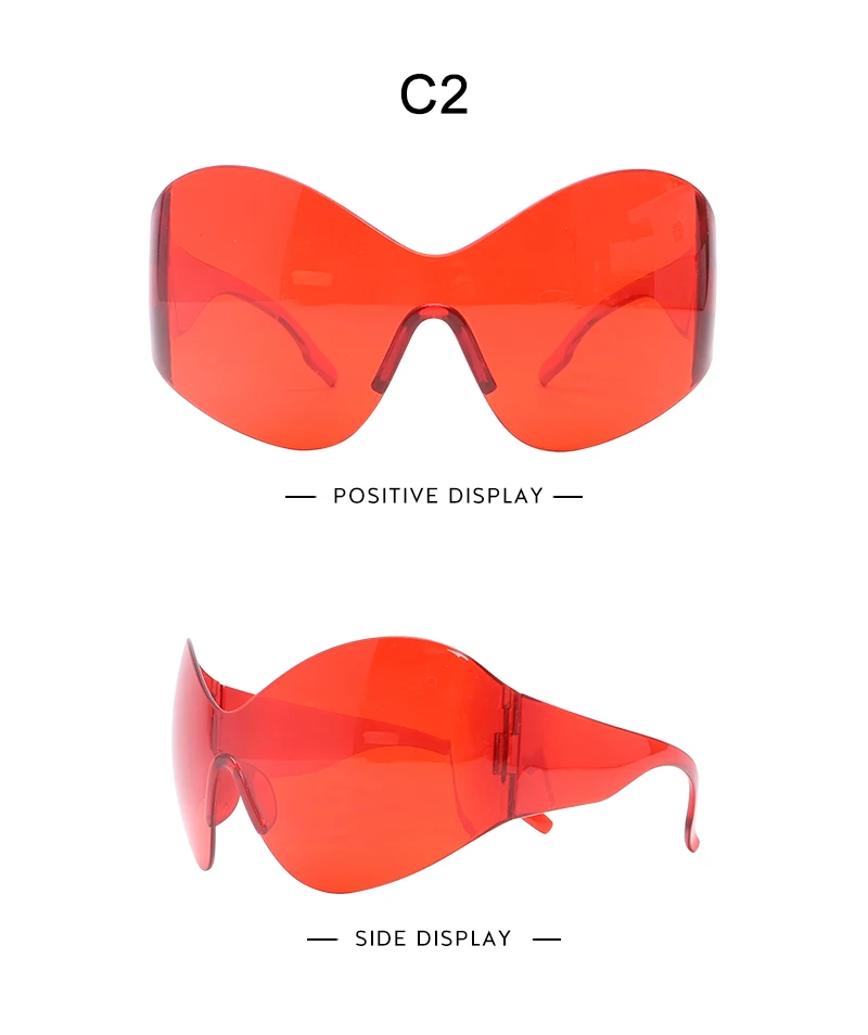 Upgrade your style with our Unisex Steampunk Oversized Sunglasses. Designed with futuristic technology and a Y2K punk vibe, these sunglasses will elevate any look. Embrace the latest trends while protecting your eyes from the sun. Stand out from the crowd with these statement sunglasses! Enjoy the sun in style and feel like a brand designer with these one piece sunglasses