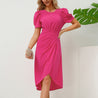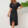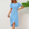 Introducing our Round Neck Puff Sleeve Slim Business Dress! Look stylish and professional with this dress that features a flattering round neck design and slimming puff sleeves. The round neck and puff sleeve design adds a touch of refinement, while the mid-waist silhouette accentuates your figure with grace. Perfect for the workplace or any formal occasion, our dress promises to make you stand out with style.
